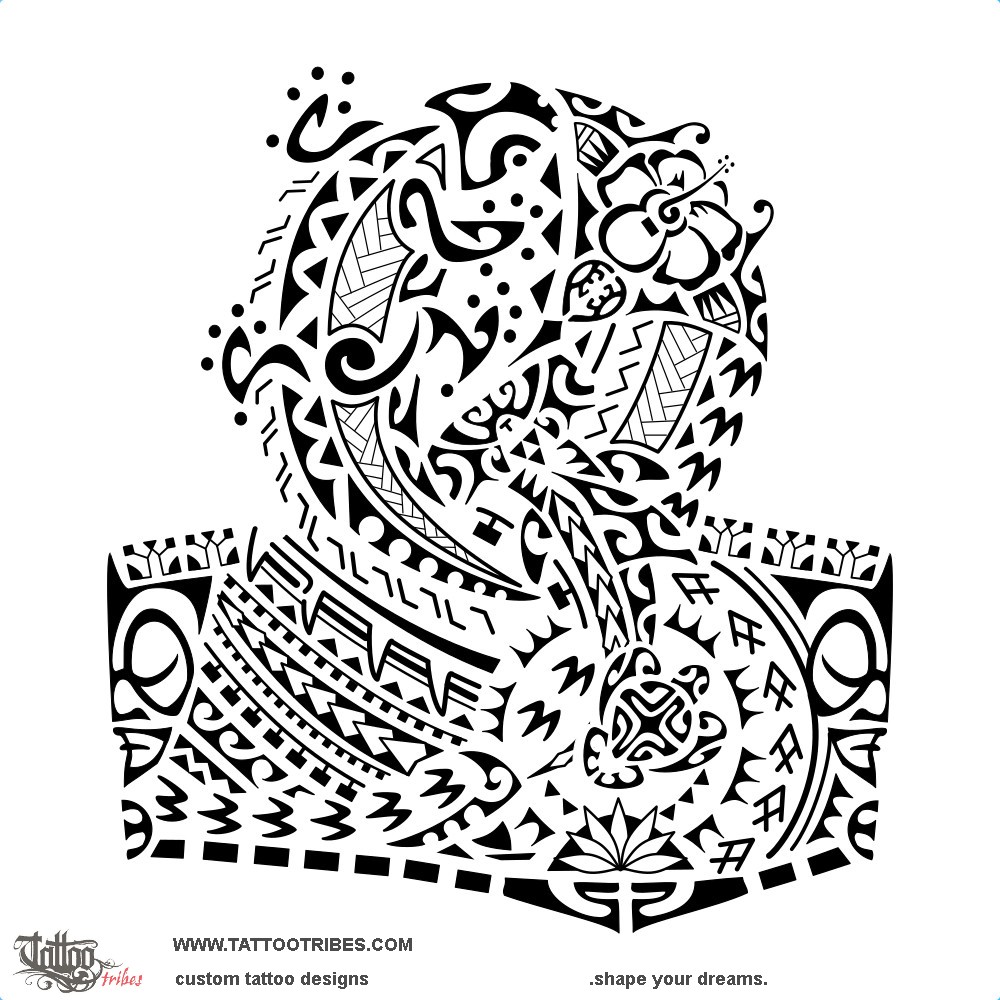 The gecko goes along the back of the shoulder, to protect him and guard his new found freedom (the manta) with the help of his tenacity and determination (represented by the hammerhead shark), also protecting his family (the turtle inside a sun to symbolize joy and eternity, with mountains for stability).