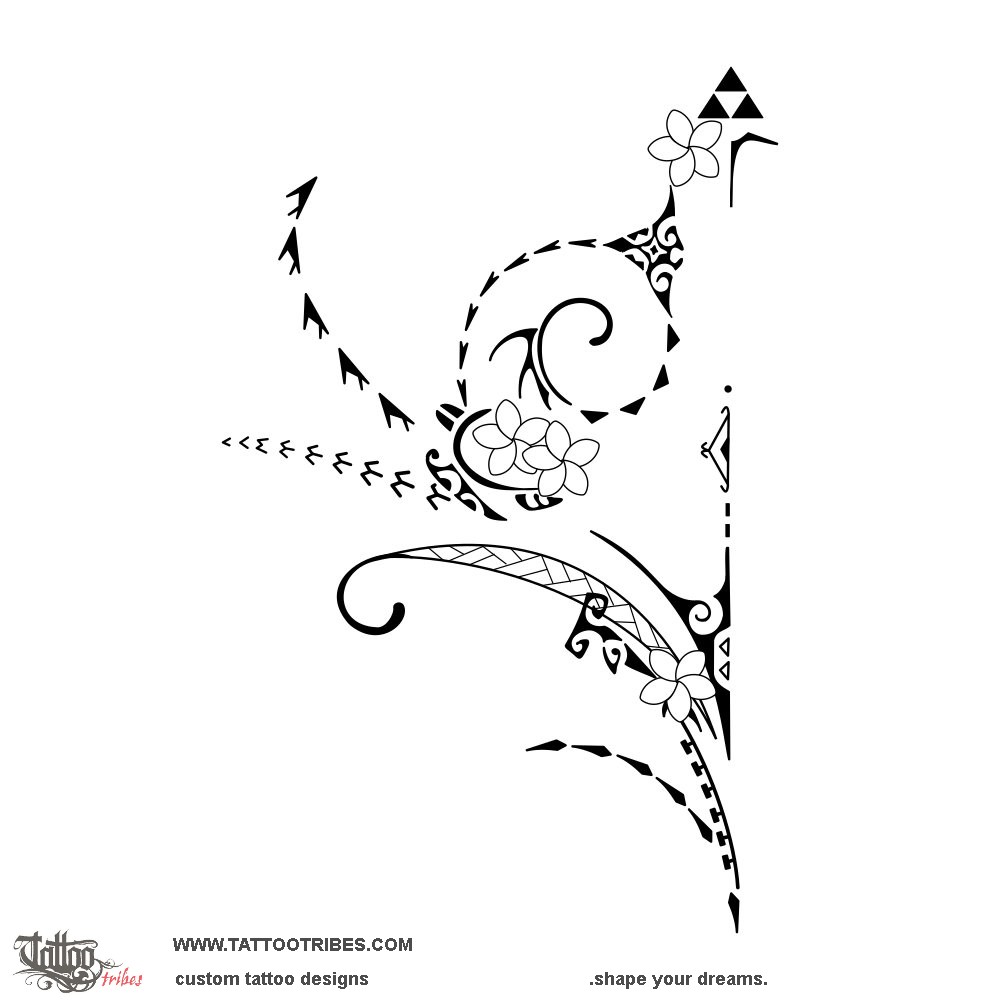 From bottom to top, the path of Kamehameha represents challenges, faced with tenacity, strength, and adaptability (spearheads, the hammerhead shark, and shark teeth) to reach e new start (the koru) and a new union (the turtle representing family, with two frangipani flowers on the shell for two children).