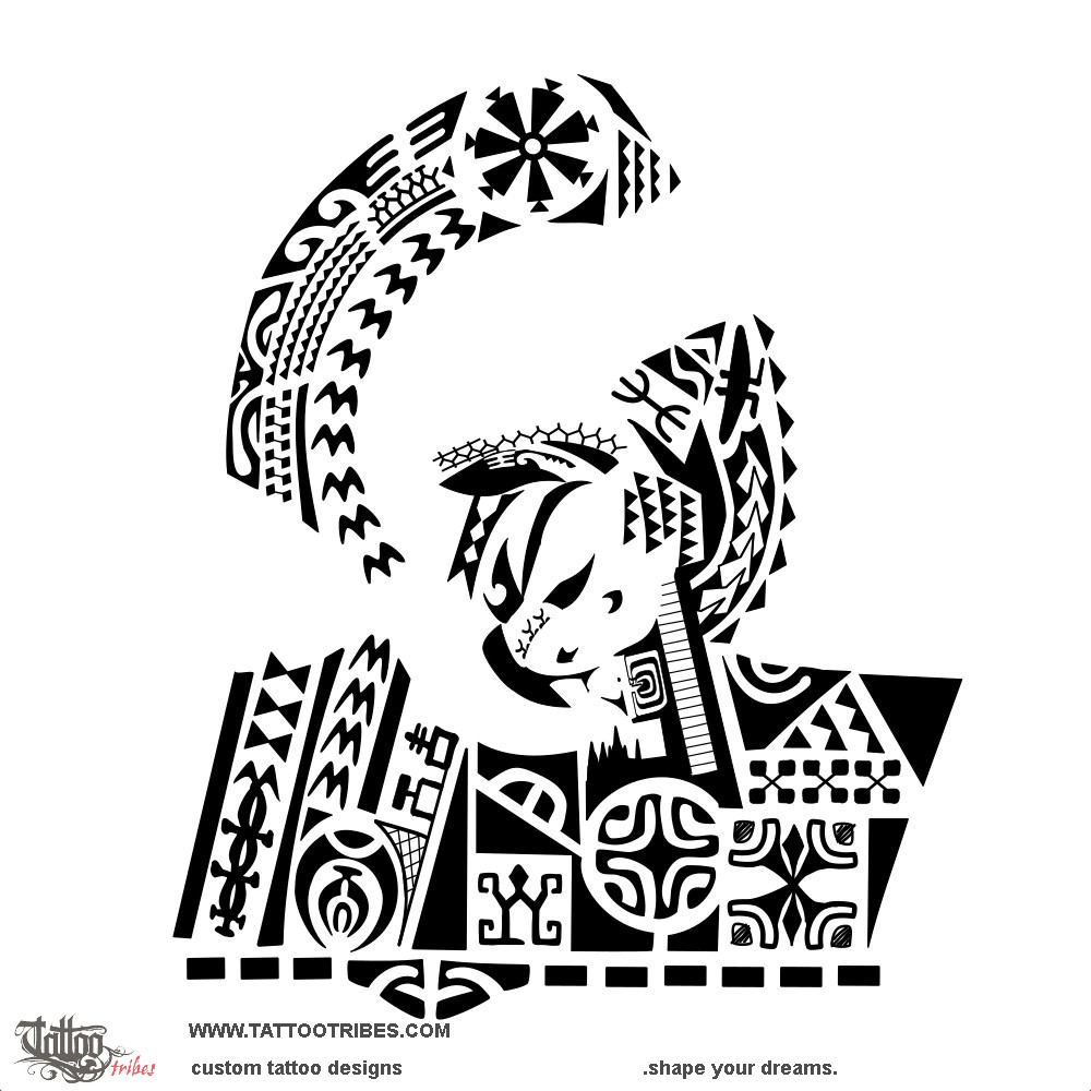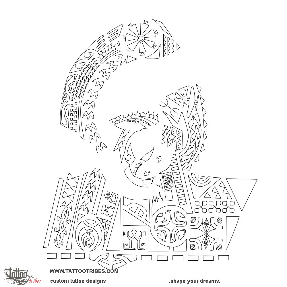 Centipede legs and spearheads represent the warrior who fights for freedom (the manta) and family (their initials are disguised in the tattoo), with a lizard for good luck and shark teeth for adaptability and strength.