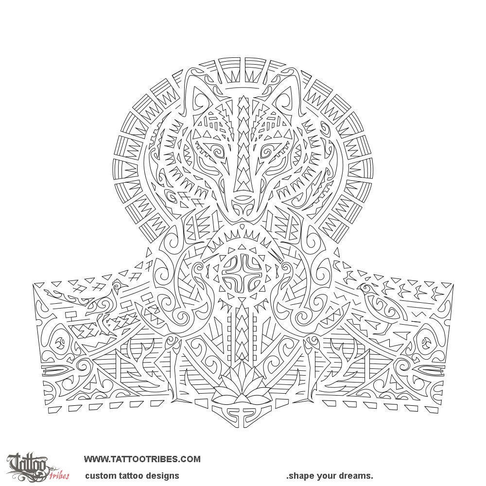 On the sides of the wolf there are two lizards in a circle and elements for prosperity (fish and fish hook, coconut leaves) shaping a bigger sun around the shoulder while stepping stones going all around the arm at the lower edge symbolize achievements, and the two tiki on the sides bring protection from all directions.