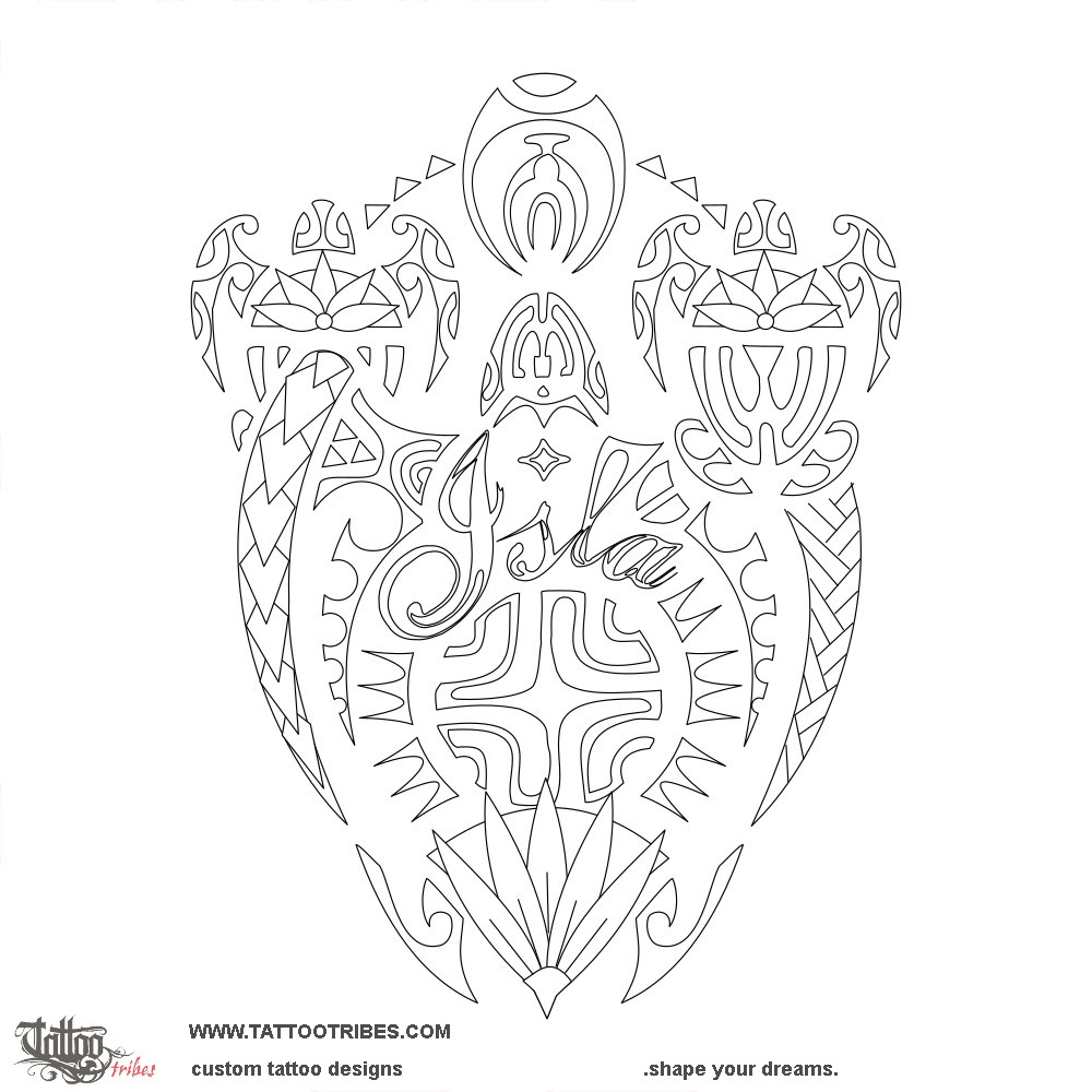 The main elements are the Marquesan cross in the center, for balance and harmony, surrounded by a sun for joy and stability (the mountains), the spearheads (strength and courage, warrior spirit), the braid (union), and the flax leaves for family unity.
