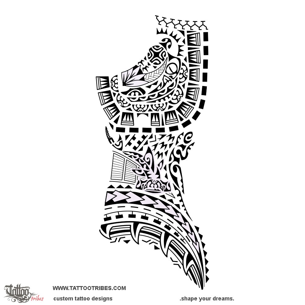 The torso part is related to his life, with initial adversities (thorns and fa'atigipusa) that led to a difficult path full of challenges (the path of Kamehameha) faced with strength, tenacity (the spearheads and the hammerhead shark with a warrior in it), and adaptability (shark teeth).