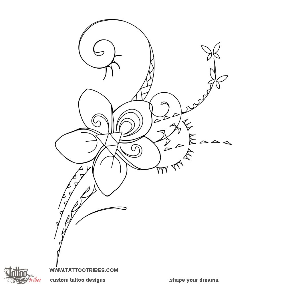 The frangipani flower represents her, and it has an ipu inside as a simbol of fertility (the mother) with two koru (her children) on its side and two tiki hands below them to show how she'll always protect them.