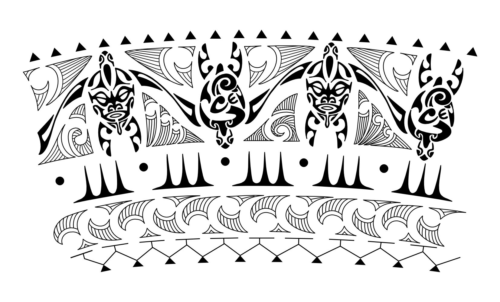 Other symbols that were added are korus (birth, new beginning), the honu shell motif, symbol of the traveller, by land and sea (mountains and islands) and shark teeth to symbolize adaptability.