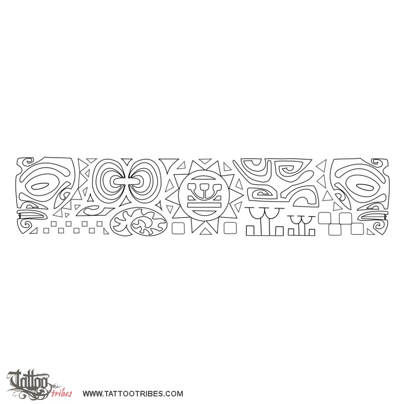 The symbol in the middle, recalling a sun, is actually a stylization of a navel, and it symbolizes independence; the symbol inside of it is an enata (person), like the two ones on the right of the navel/sun. The one in the middle has a different style compared to the other two to represent being unique. On the left there´s a sea shell, a symbol of love and shelter. Above the enatas, on the left, there is an ipu, a symbol of femininity and fertility, and on the right there´s a traditional lizard (good luck). The two tikis facing opposite directions represent protection from every side and the shark teeth motif surrounding them recalling a sun symbolizes adaptability and strength. The sun represents life and eternity.