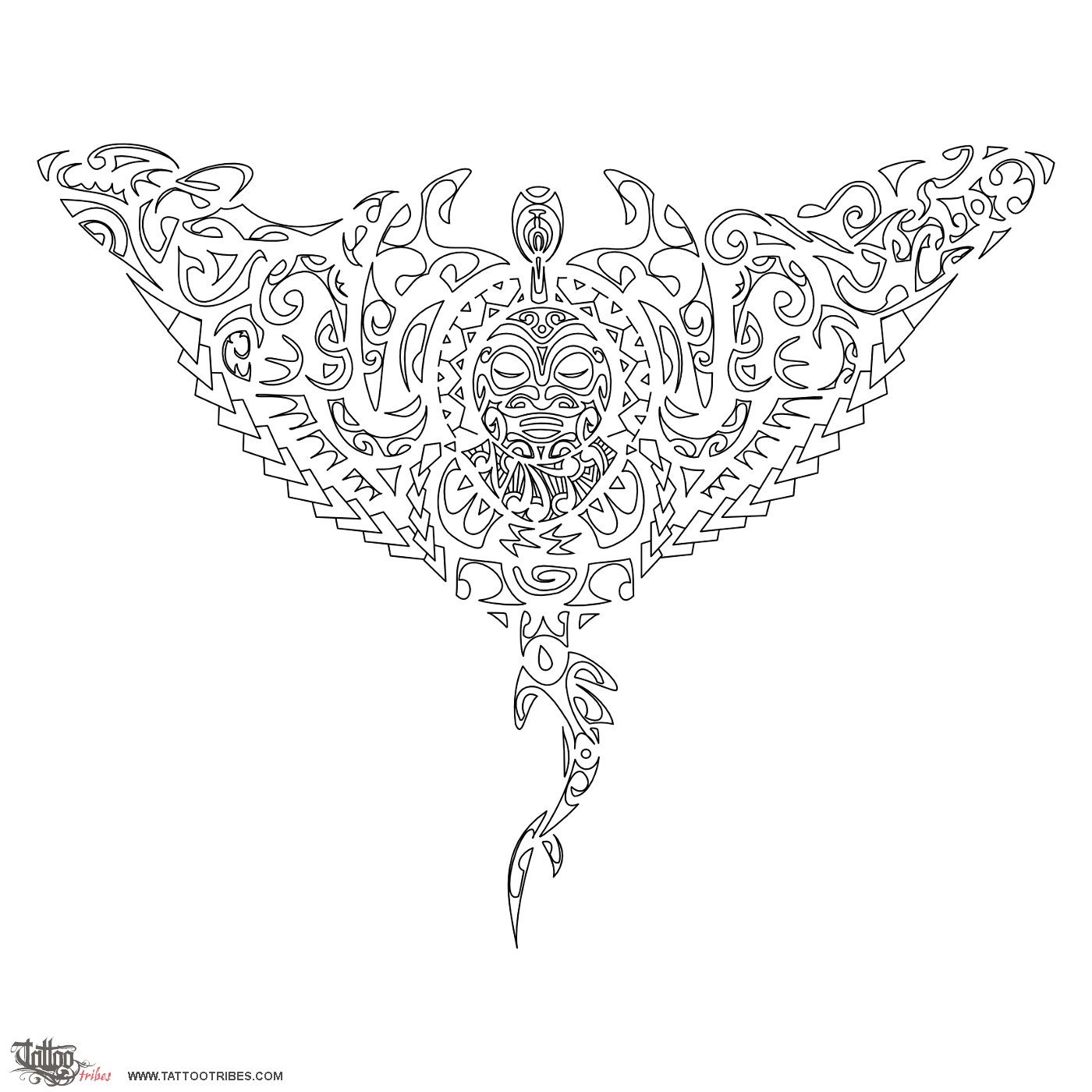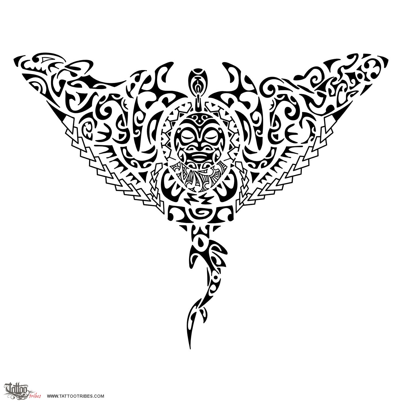 The tips of the manta wings include a dolphin on the left (friendship, joy, game) and a gecko on the right (health, communication to the spirits).