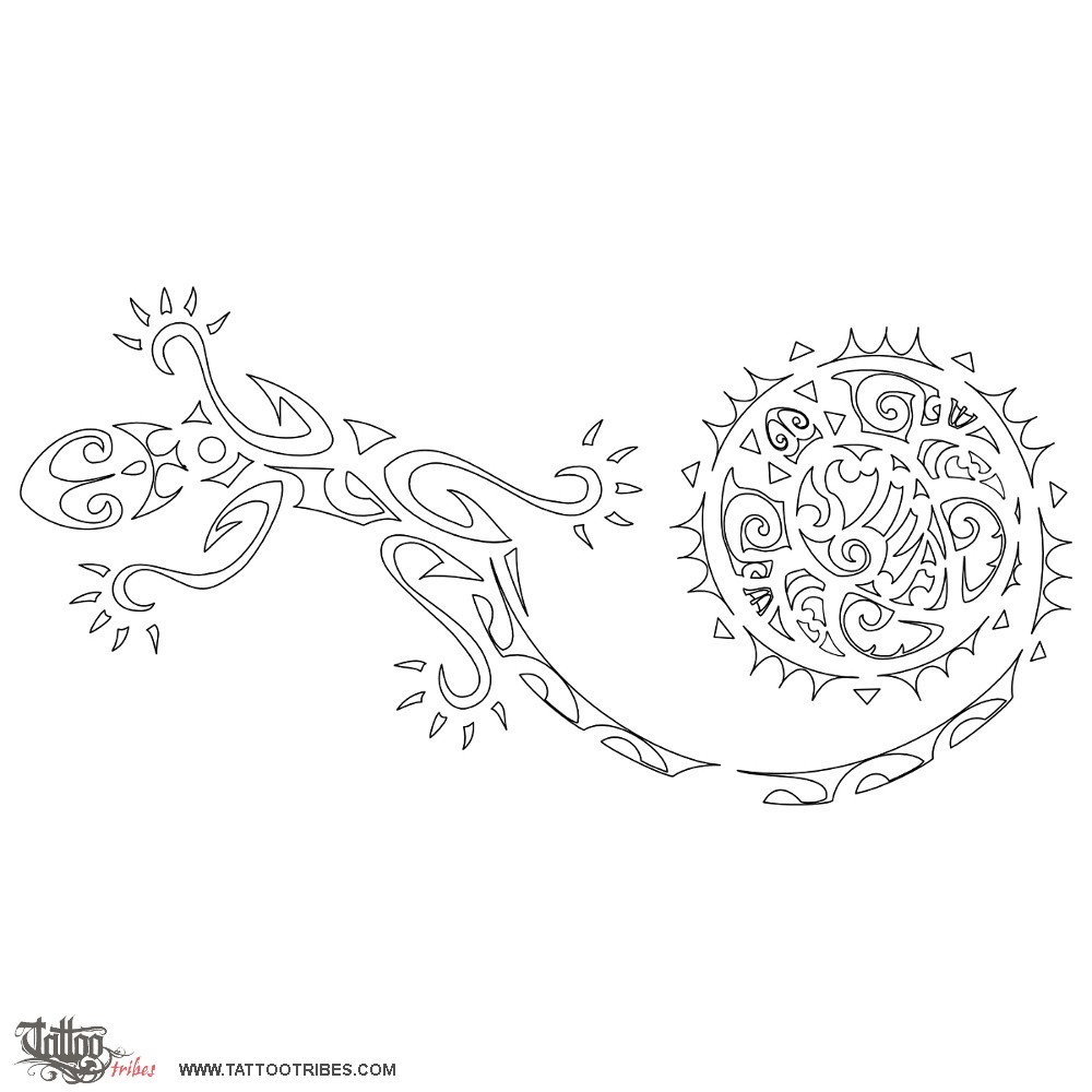 The head of the gecko includes a bird (freedom, watching the world from a higher perspective) and the hammerhead shark motif, symbolizing tenacity and determination.