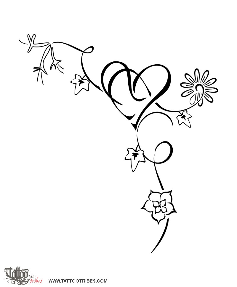 Carlene requested a heart to join her headletter C with the initials of her daughters, A and A, decorated by their birth flowers. The two As are placed on the sides of the C, embracing it and being completed by it. The flowers associated to her daughters are daisy and honeysuckle, whilst the ipomea, or morning glory, is associated to Carlene. The ivy leaves added to the tattoo symbolize attachment, faithful love and tenacity.