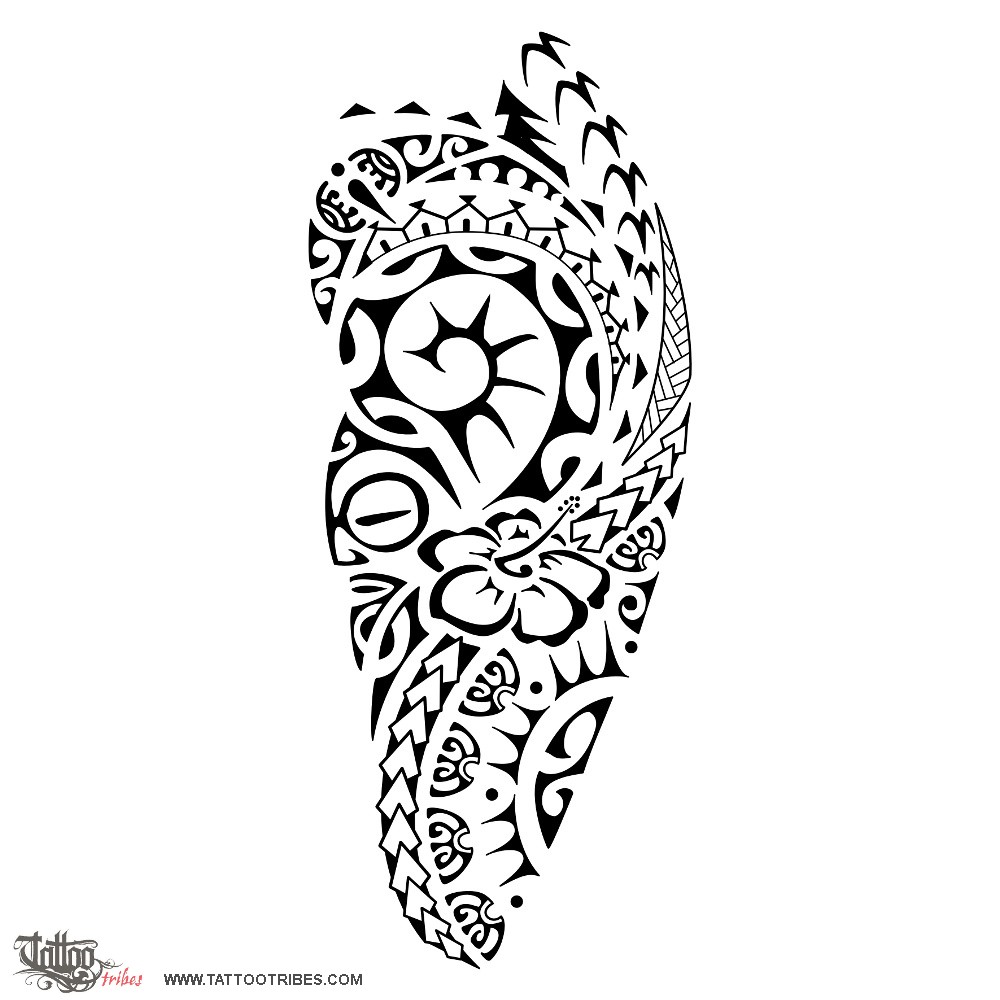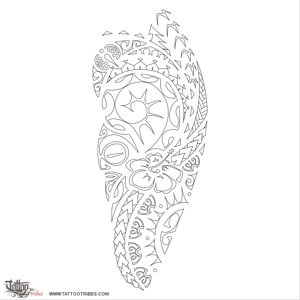 Other elements are an octopus tentacle (tenacity, intelligence), shark teeth (strength and adaptability) and coconut palm tree (prosperity); the latter is placed on top behind the bigger sun in order to visually recall the sun rising through pine trees behind the edge of a hill to symbolize her love for nature and for the beauty which can be found in small things too.