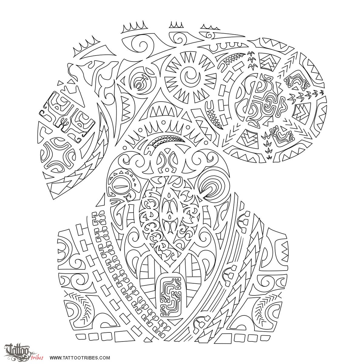 The shell of the turtle is shaped by the maorigram "Herbert" on the left (with a tiki making the left front flipper) and by the maorigram "Doris" on the right (with an ipu on the related flipper).