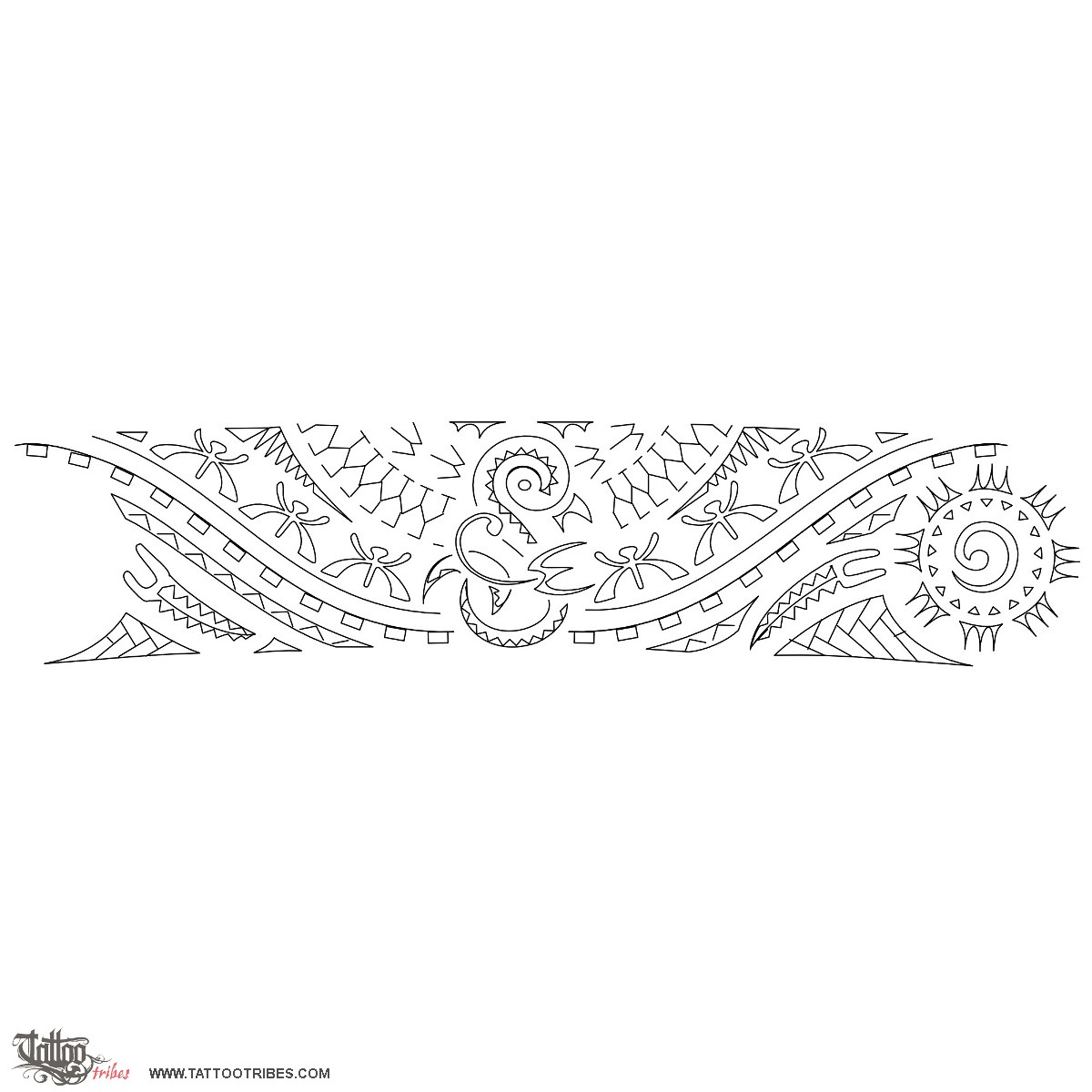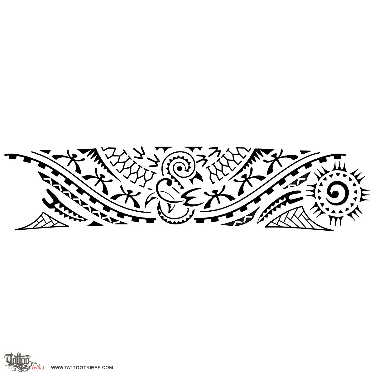 The manaia in the middle has to be placed on the front of the leg, towards the future whilst the koru inside the sun on the right of the design goes on the back of the leg, bound to the past.