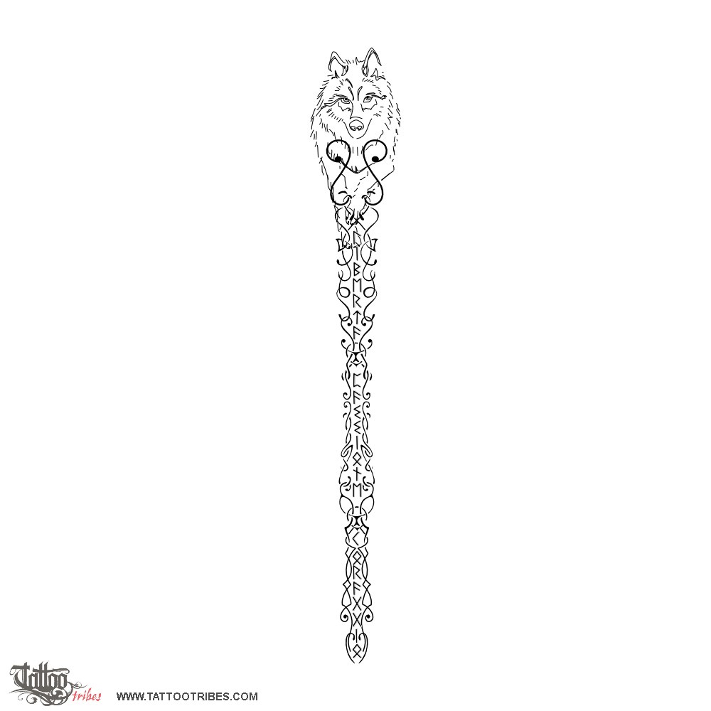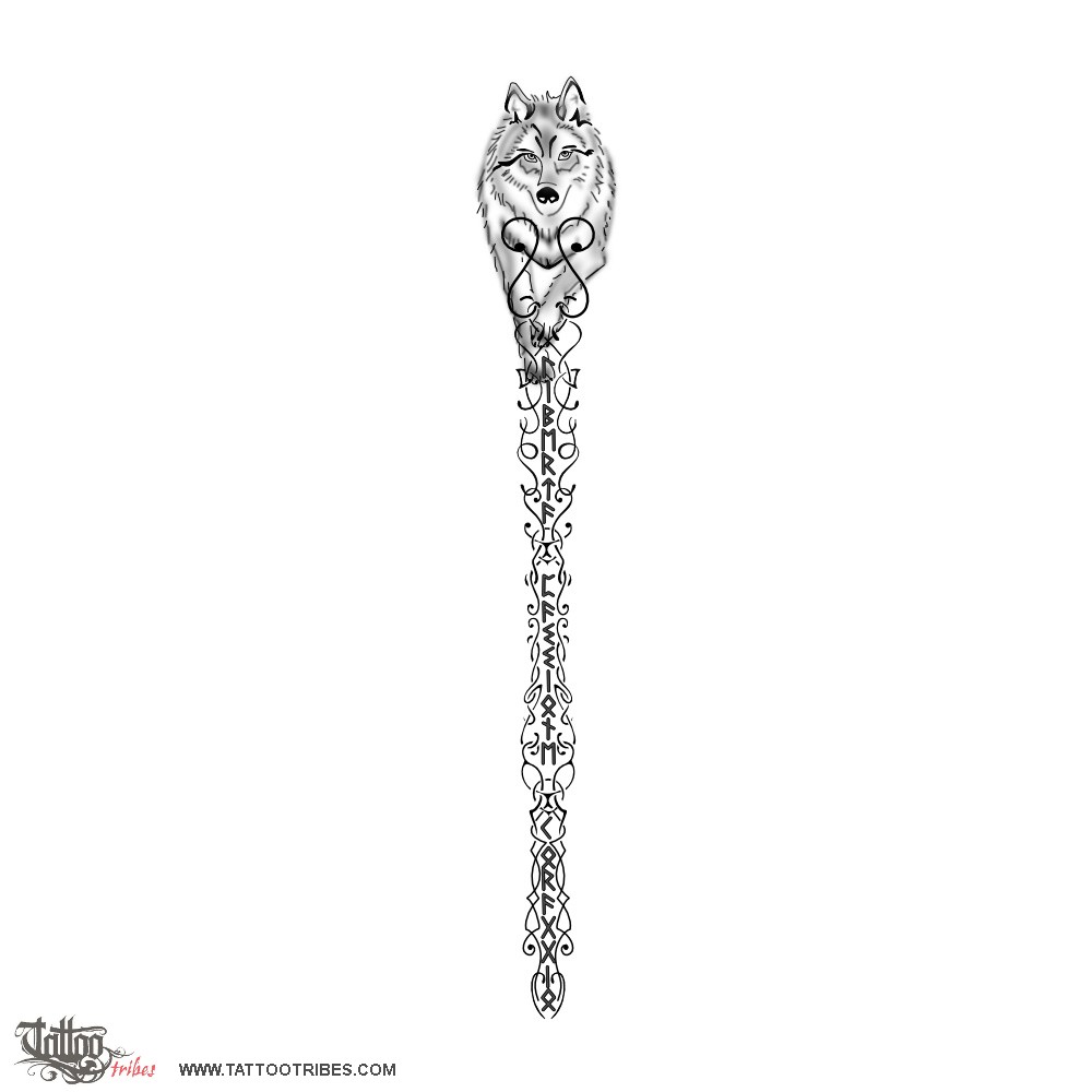Ultimate 3x2 bundle: $Elisa requested a tattoo developing along her spine containing a wolf seen from front, in a realistic style, surmounting three words transliterated using the Elder Futhark runes surrounded by elements like spirals and waves.