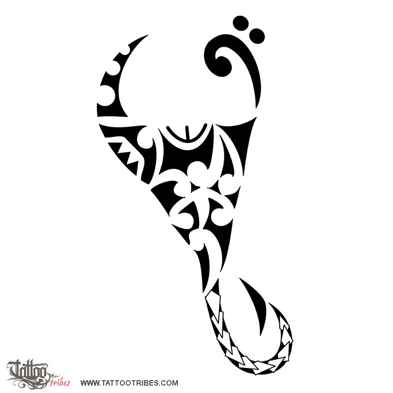 The two claws are an octopus tentacle (adaptability, tenacity) and a bass clef (the music that unites them) shaped by a koru (life) while the tail is made of spear heads (warrior, protection) shaping a fish hook (prosperity).