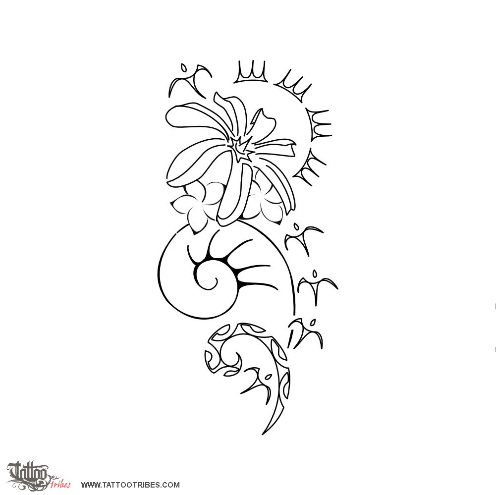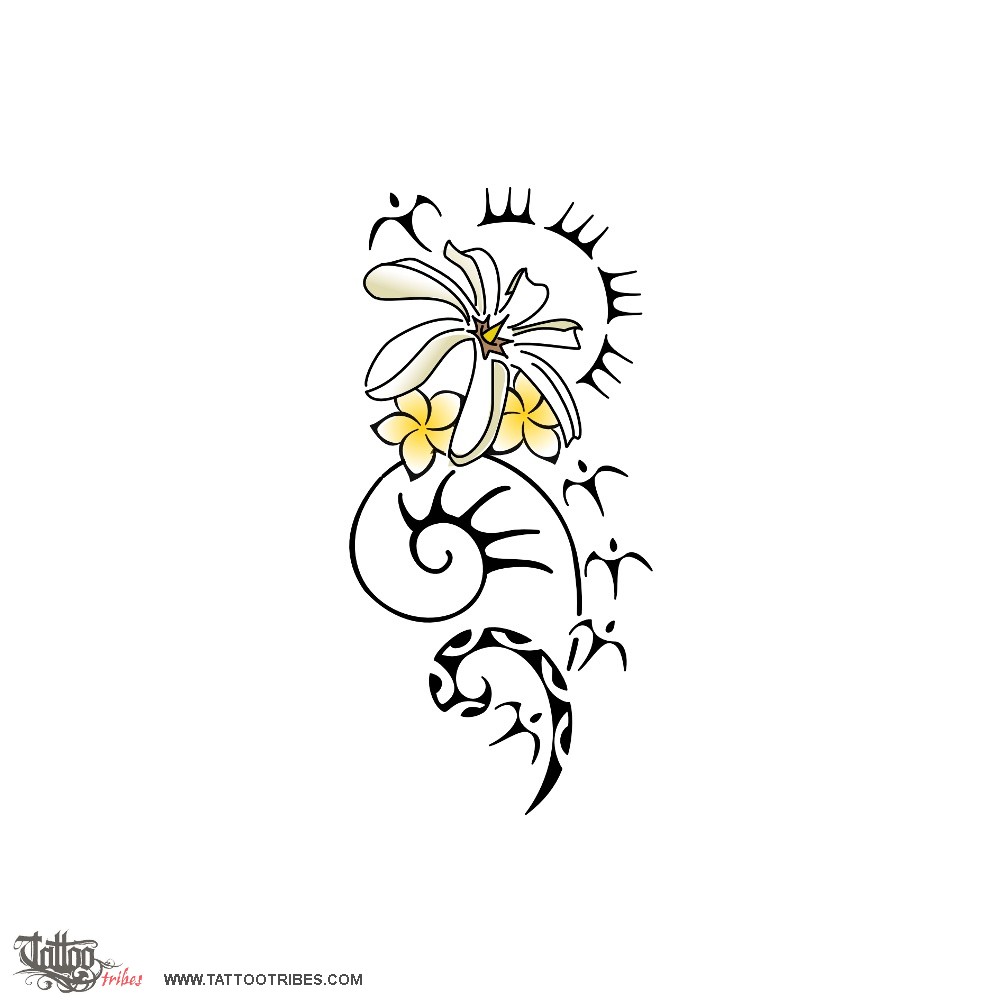 The sea shell is love, biggest since it´s most important, the tiare flower symbolizes peace and harmony, with frangipanis for beauty and safe shelter.