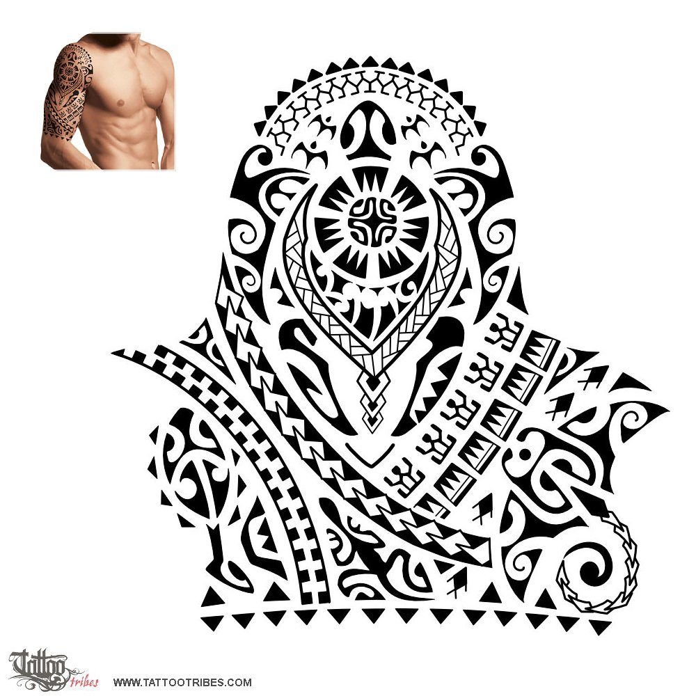 On the shoulder of this half sleeve tattoo the turtle symbolizes the importance of family, which gives Amos balance and joy (the sun inside the shell with a Marquesan cross in the center).