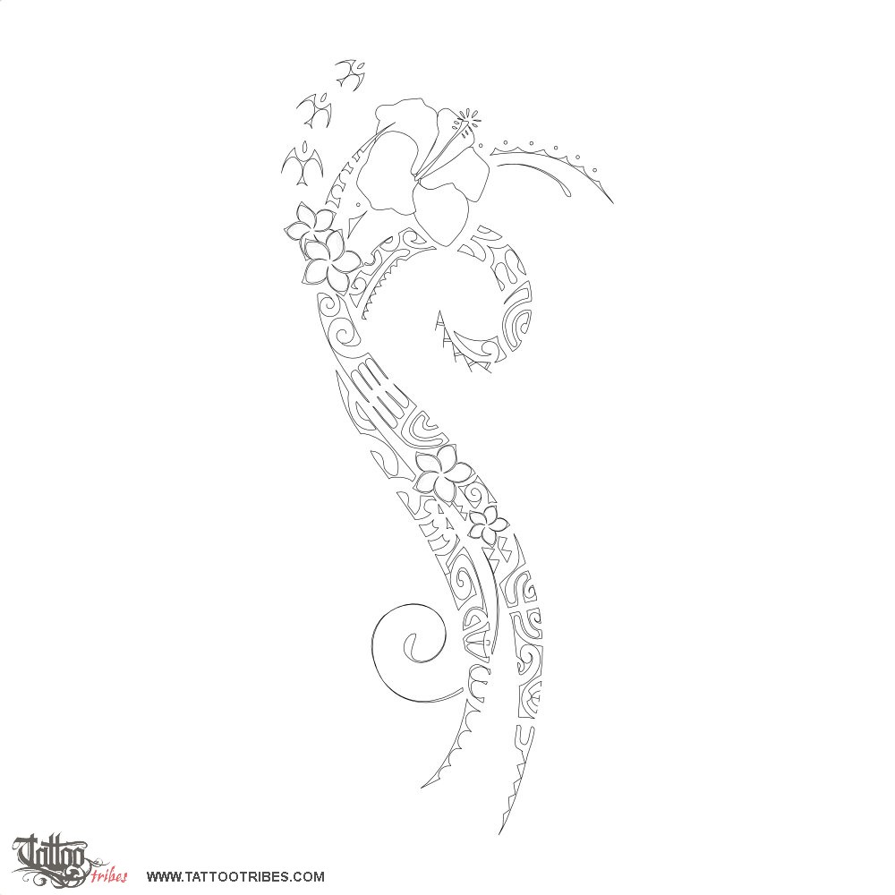 The main part symbolizes her life, with good moments all along the way (the flowers of frangipani) leading to a rebirth (the koru shape, the spiral on top) and to happyness (the flower of hibiscus).