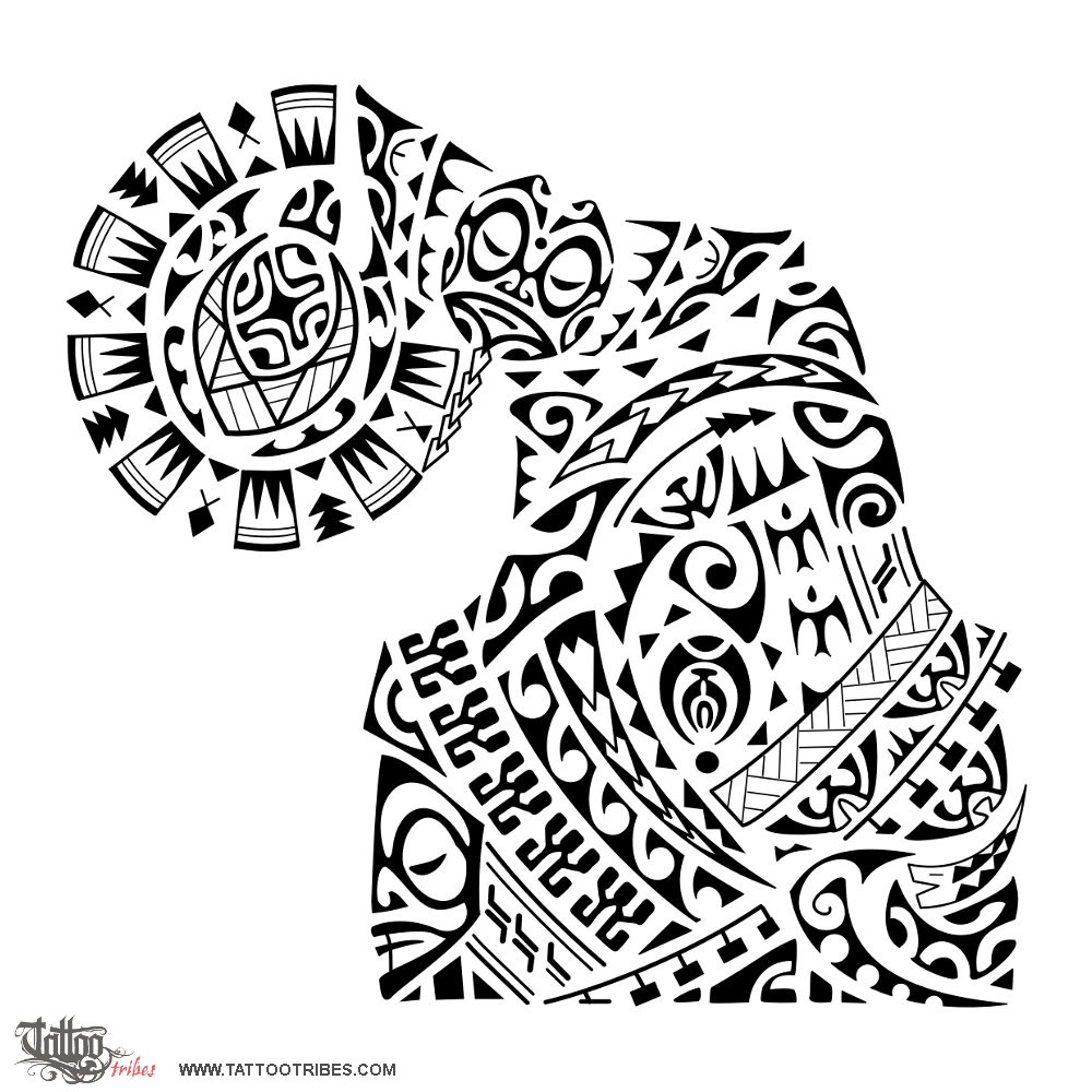The tiki in its center guards upon this transition between past and future, on the pec close to the heart where the turtle symbolizes family union, with symbols for balance, joy and prosperity and with the letters A and J inserted as maorigrams in the front fins.