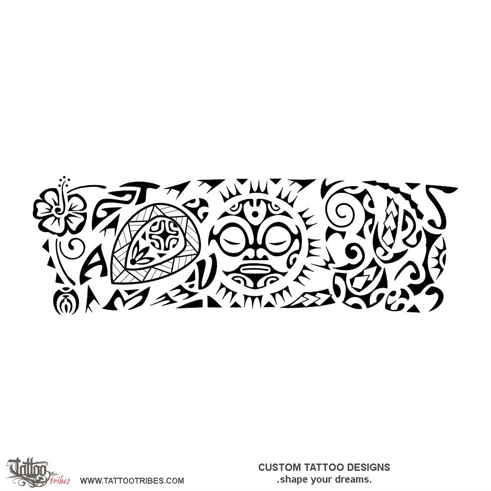 This armband tattoo was prepared for Tony and it represents protection to his family, represented by the turtle with the family members head letters on the 4 flippers (T,V,A,M), with a braid and flax leaves for family union and a Marquesan cross for harmony.
