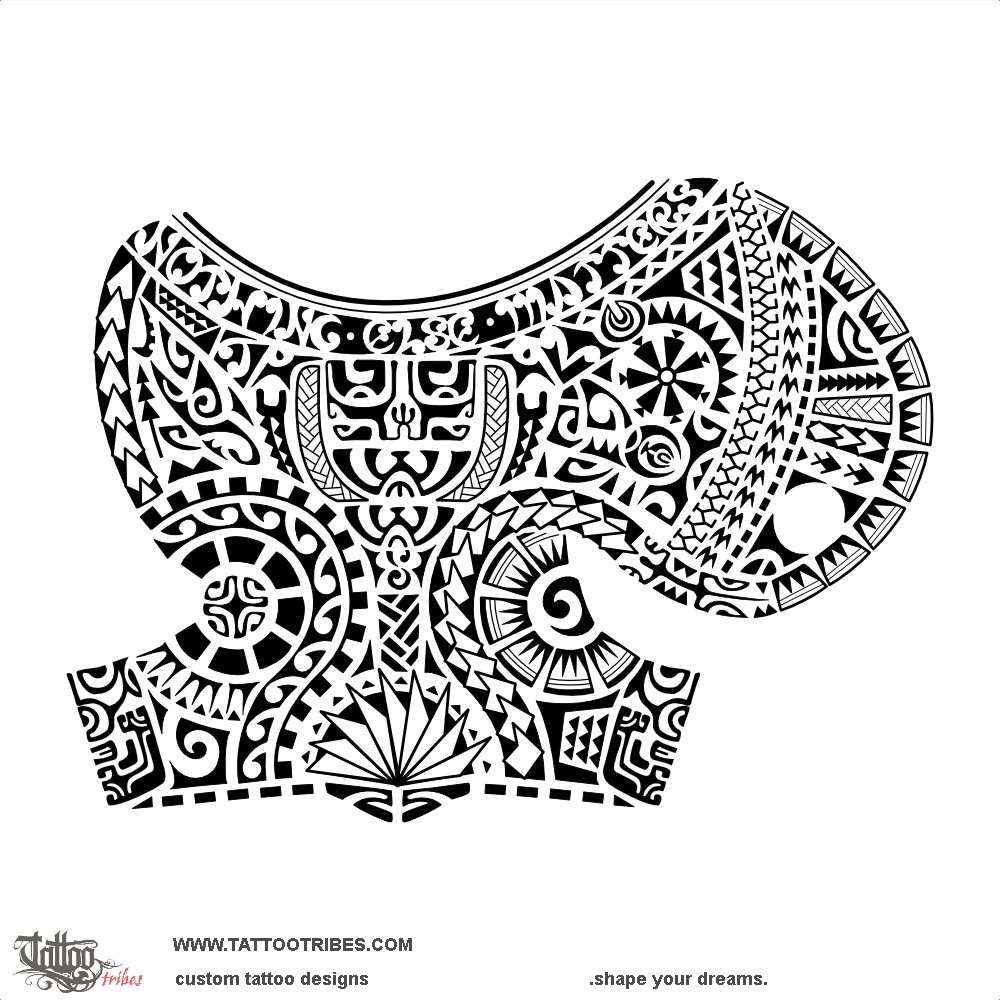 On the pec, a row of ancestors looks after them and protects the new voyage they are going through in life (the row of birds) and all that it will bring.