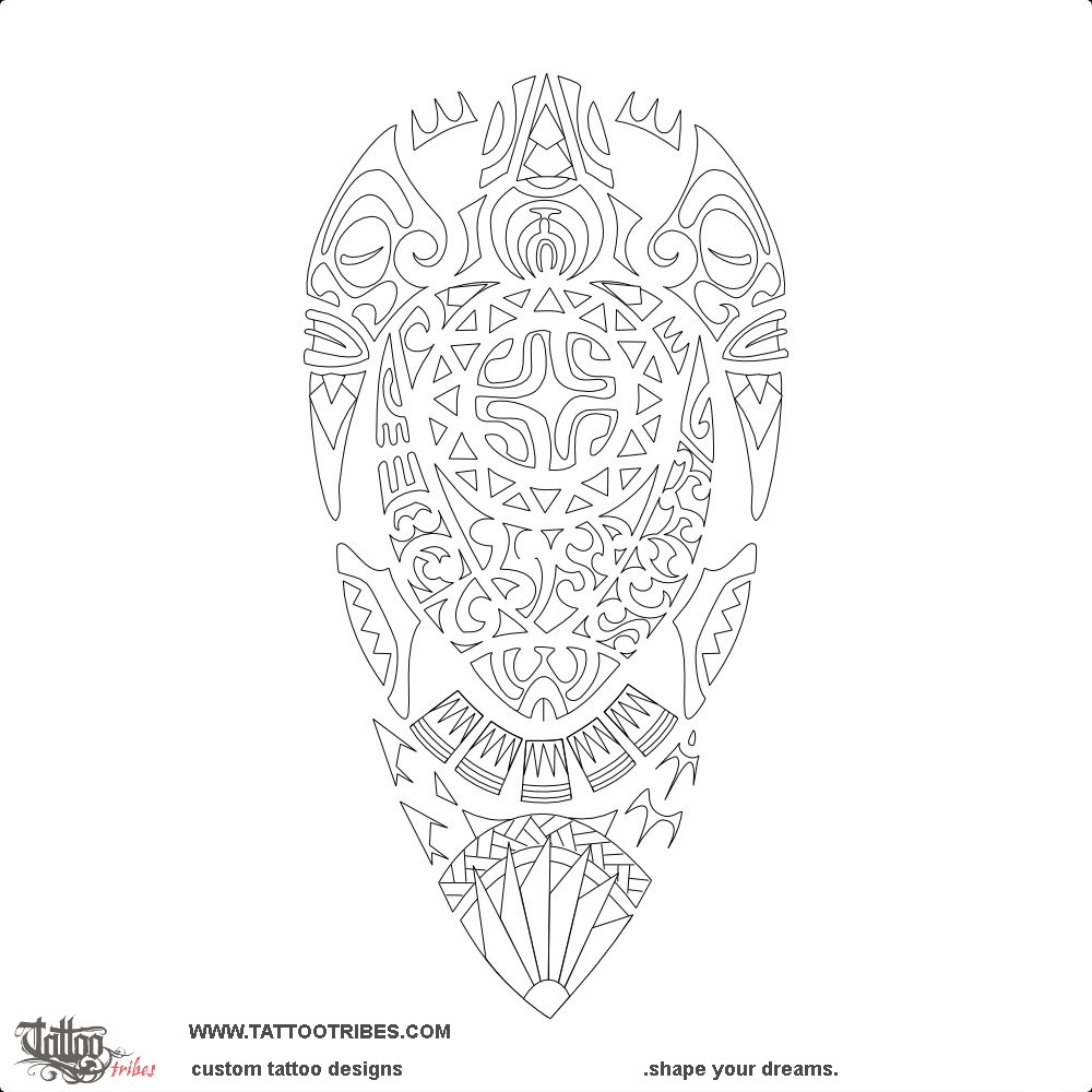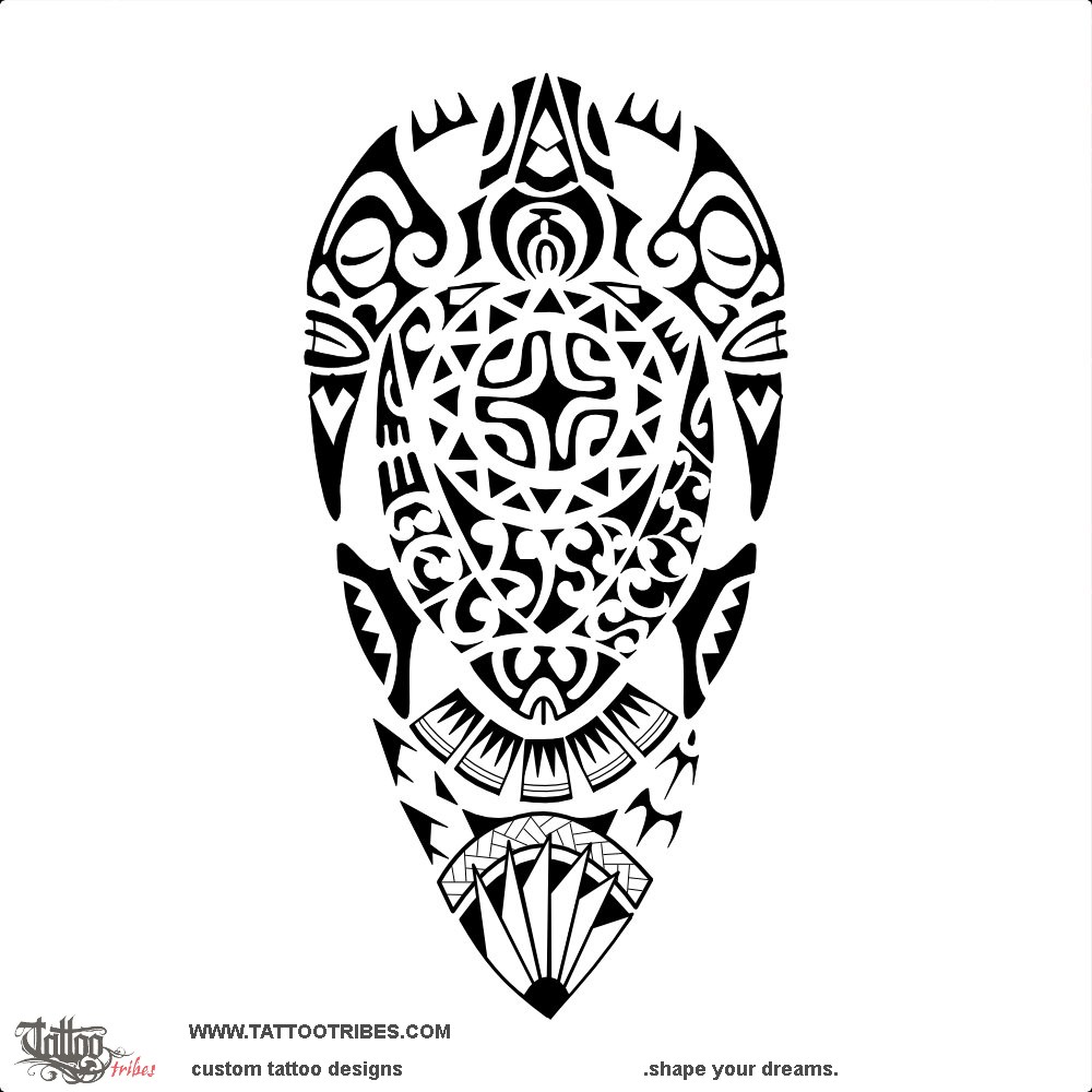 The turtle has two tiki on the front flippers to bring protection to family from all sides, while spearheads in the head and the enata on the lower end of the shell represent a warrior.