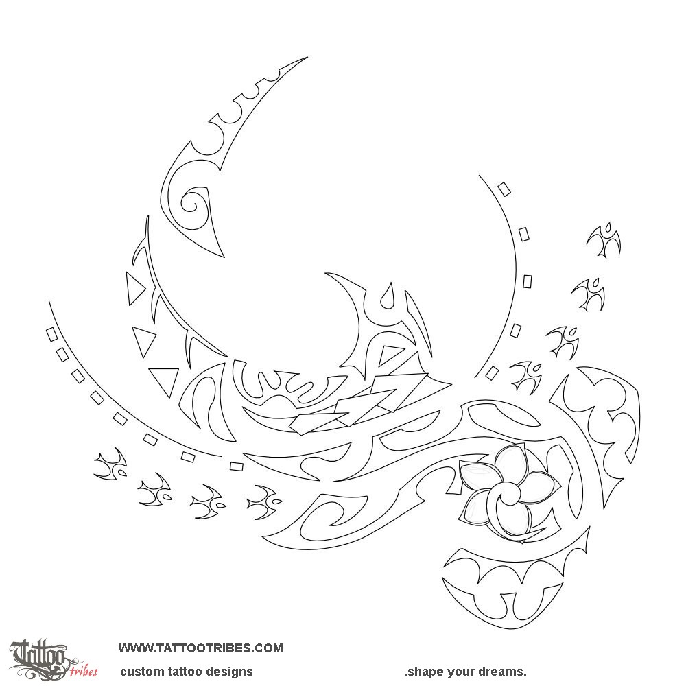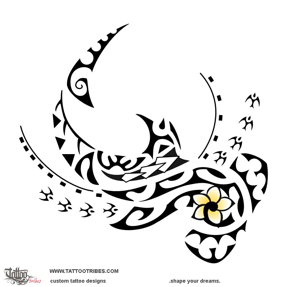 The frangipani flower is a symbol of femininity while the fish hook indicates prosperity.