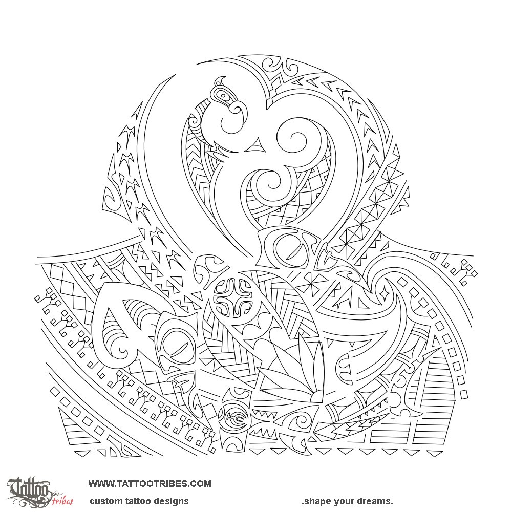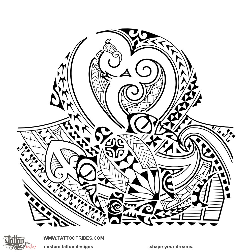 The turtle has two tiki on the front flippers for protection from all sides, braids, flax leaves, and chasing birds for unity and support always granted to the loved ones, and a Marquesan cross symbolizing that family gives him balance and harmony.