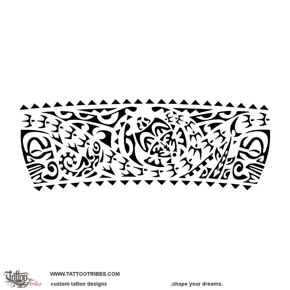 The main element in this Polynesian legband tattoo designed for Peter is a manta symbolizing freedom and beauty, which fills the whole upper part of the design, with a turtle in its center to represent family.
